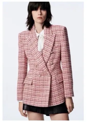Lapel collar blazer with long sleeves with pronounced shoulders. Front flap pockets. Front double... Show more