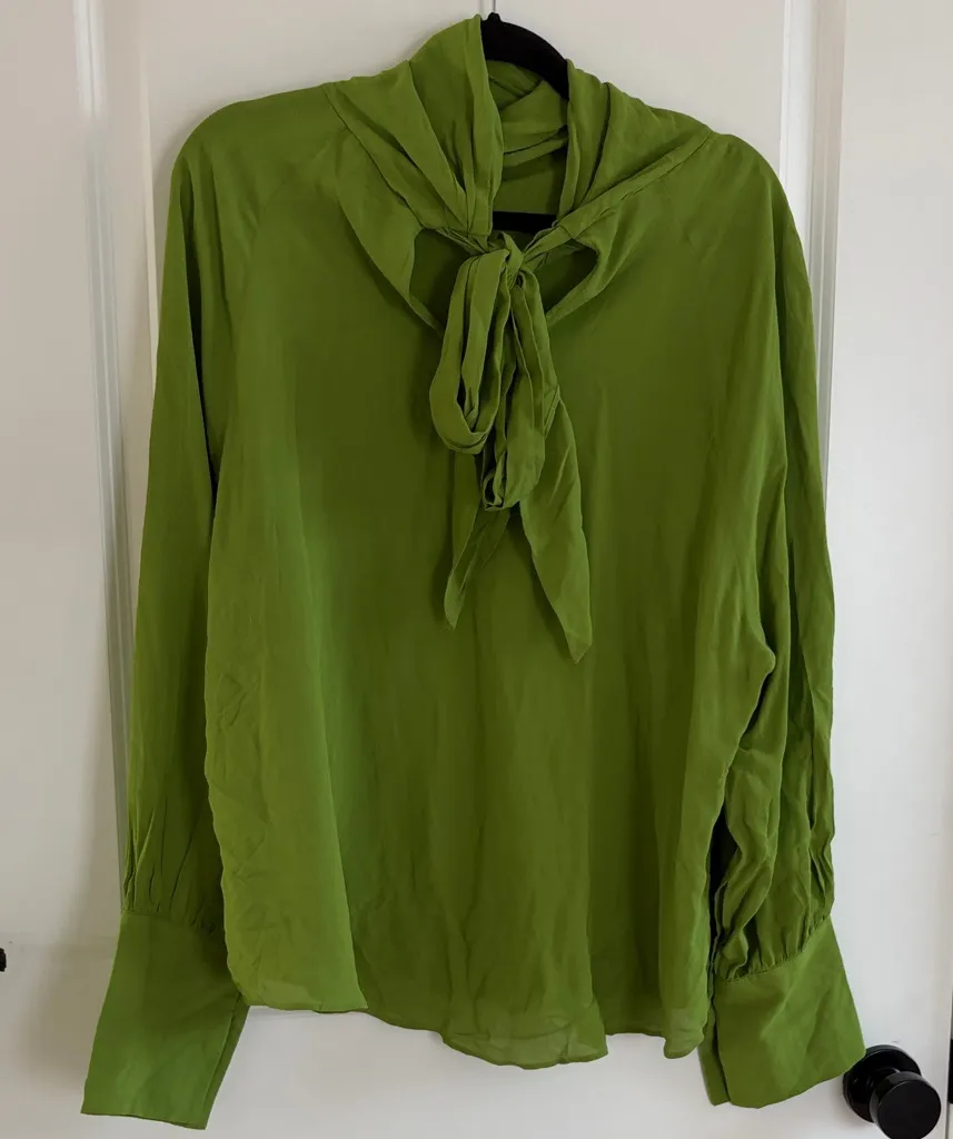 Chic Zara blouse in vibrant green. Features a stylish tie neck. Perfect for a bold look.