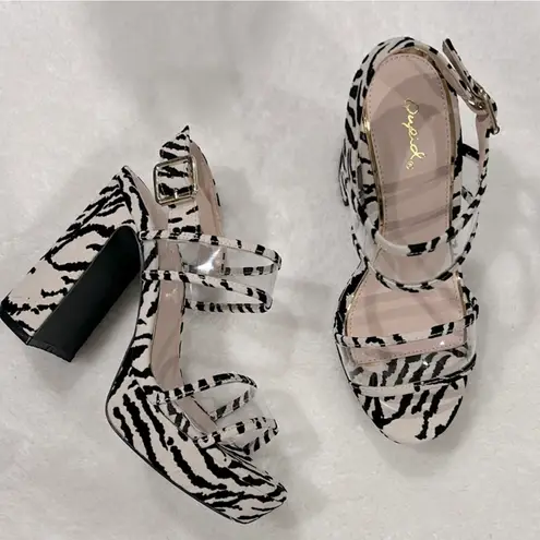 Embrace your wild side with these zebra print suede heels! Step into style and make a statement with these unique and eye-catching shoes. Elevate any outfit and unleash your inner fashionista with these must-have heels. -2 Band ankle strap sandal -PU clear strap sole heel -1” Heel height- -5” Round heel -Supper comfy Fit true to size -Off white in color with black