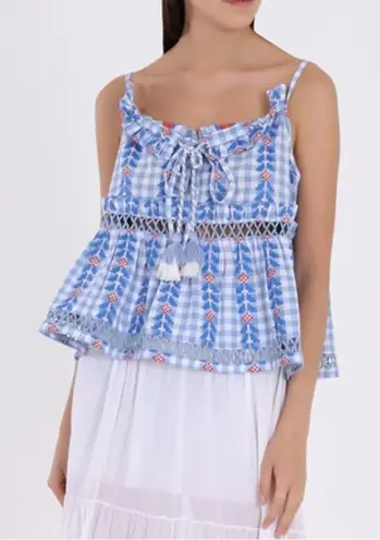 DoDo Bar Or Blue & White Gingham Print Tie Tassel Sleeveless Cotton Top This charming top features... Show more